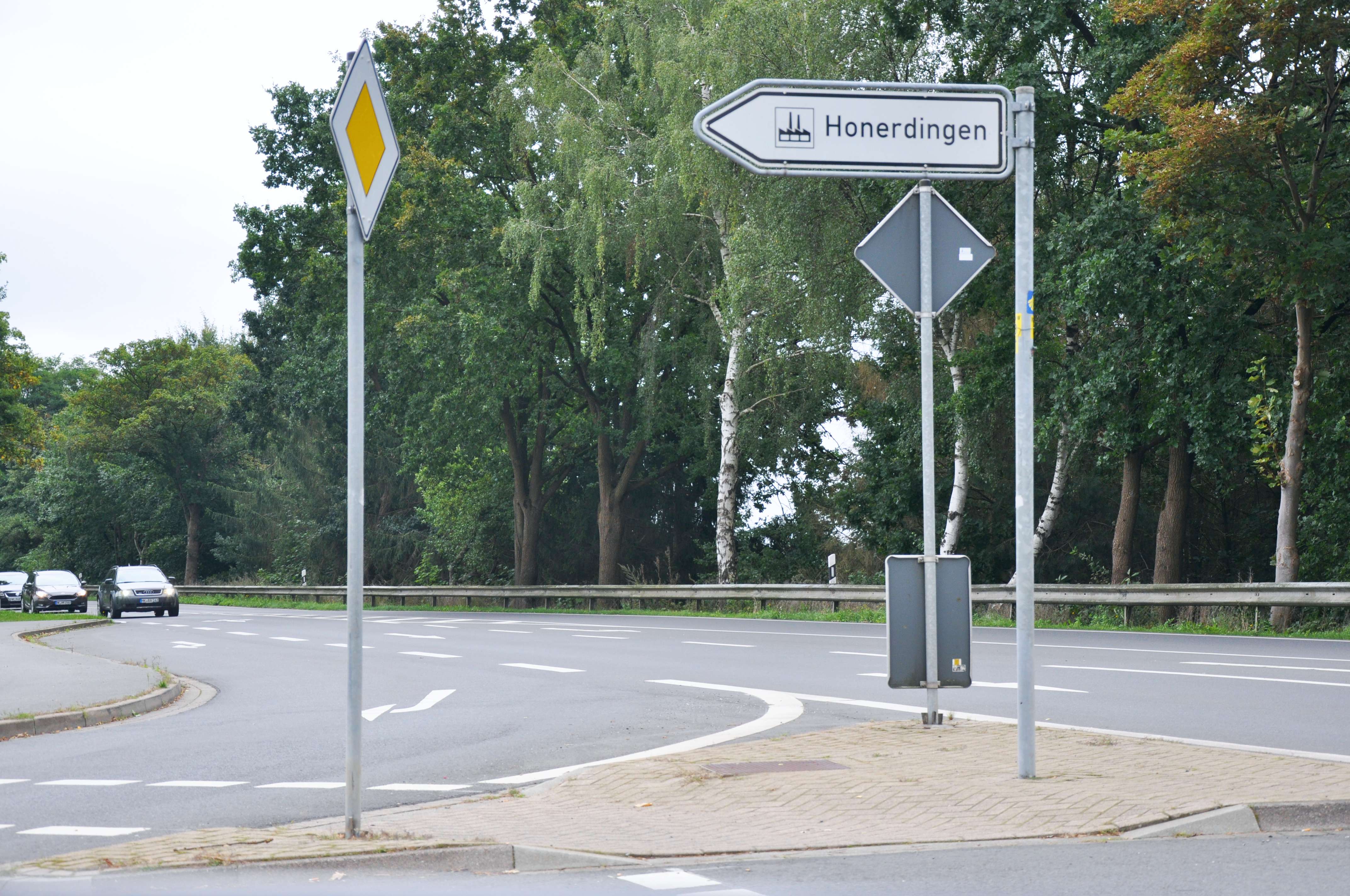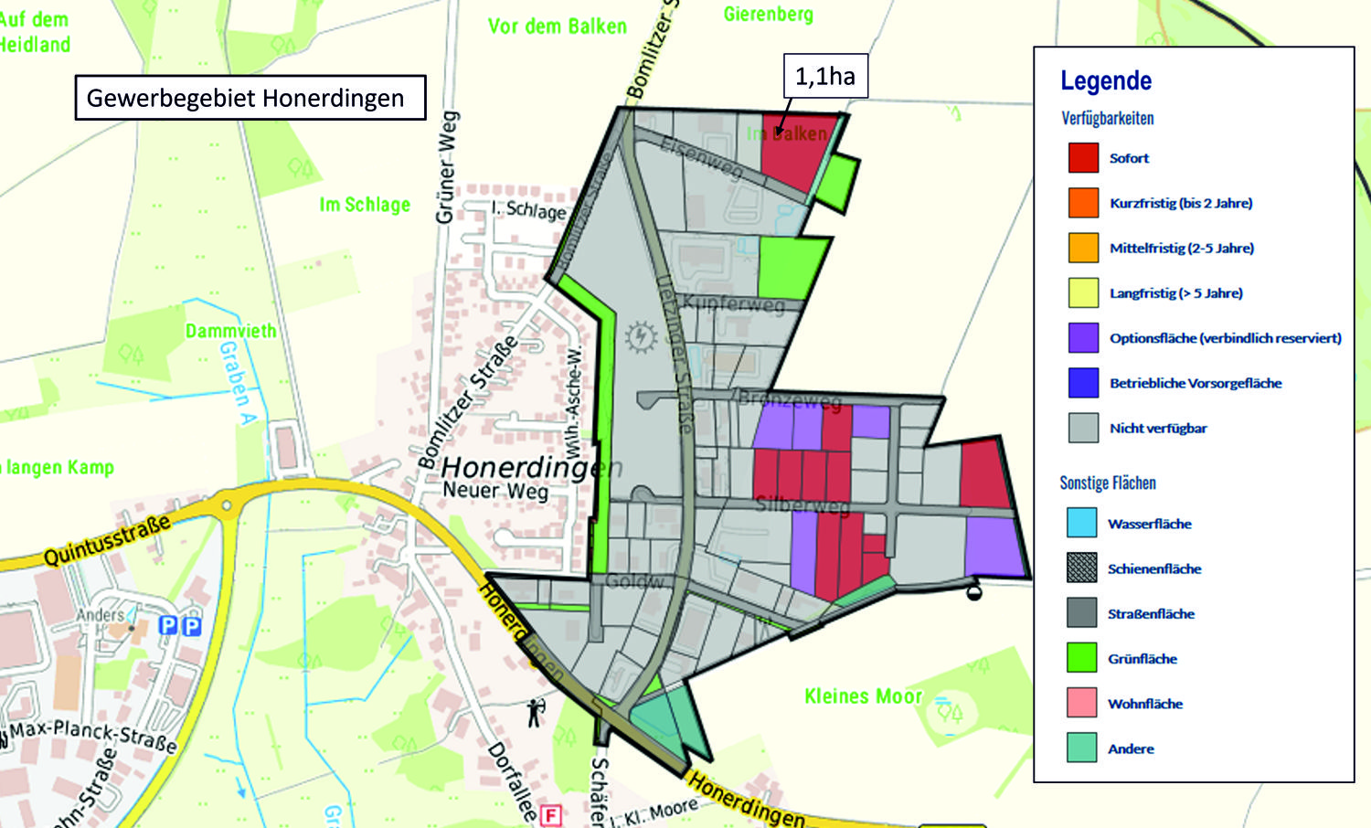 Die Karte zeigt das Gewerbegebiet Honerdingen mit verschiedenen Flächenverfügbarkeiten, gekennzeichnet durch Farben gemäß der Legende (z. B. rot für sofort verfügbar, violett für Optionsflächen und grau für nicht verfügbare Flächen). Zudem sind Straßen, Grünflächen, Wohnbereiche dargestellt, die das Gebiet geographisch und funktional strukturieren.© Metropolregion Hamburg/GEFIS