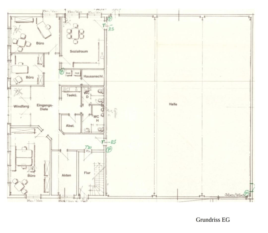 Im Erdgeschoss befinden sich vier Büros. Ein fünftes Büro wurde durch den Vormieter als Werkstatt genutzt, könnte aber auch wieder als Büro genutzt werden. Ein Glasfaseranschluss für schnelles Internet ist ebenfalls vorhanden. Zu den Büros gelangt man über einen großzügigen Empfangsbereich mit Windfang und Eingangsdiele. Es sind außerdem zwei Küchen sowie ein Abstellraum vorhanden.