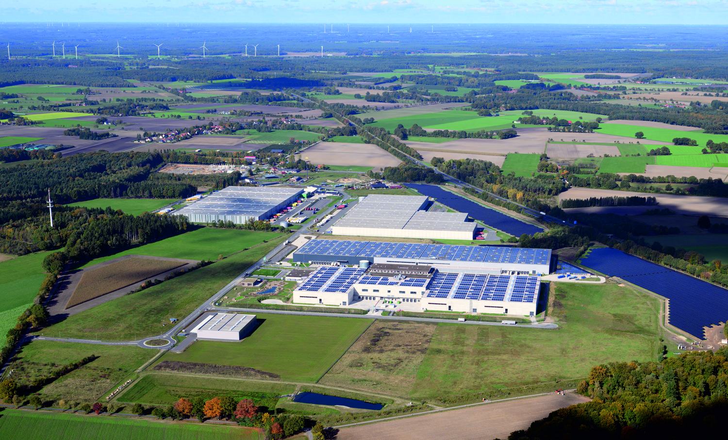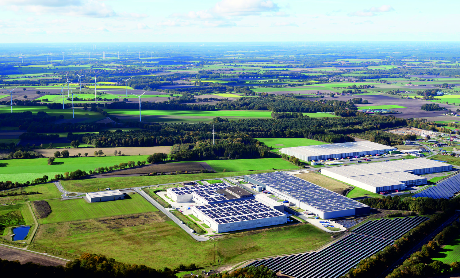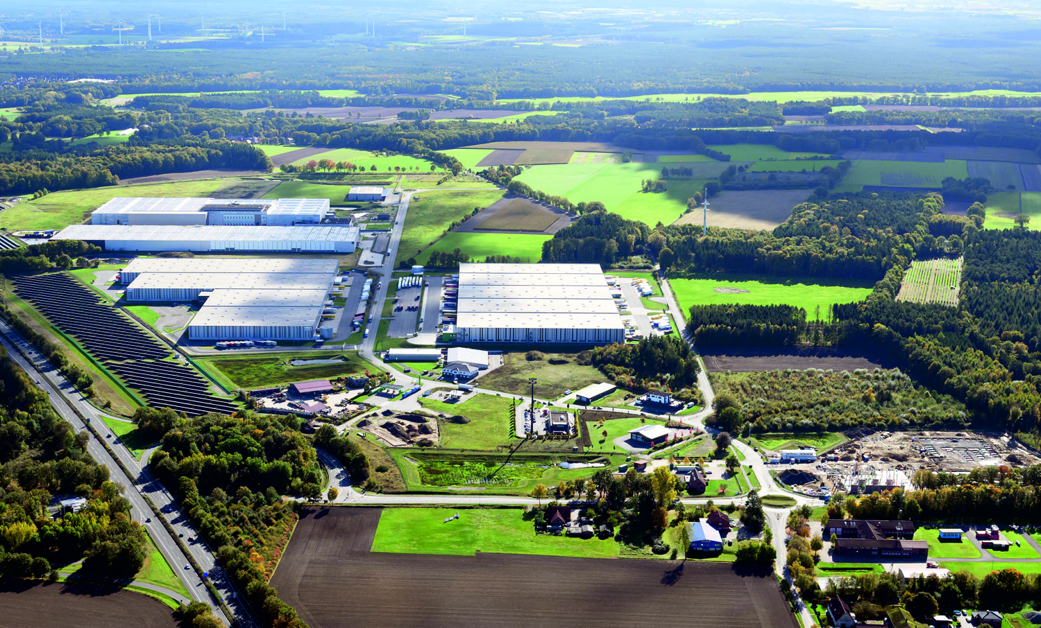 The image shows an aerial view of an extensive rural landscape with fields, forests and wind turbines in the background. Several large buildings and solar panels on roofs can be seen in the foreground, suggesting industrial or commercial use. © Deltaland, creator: Falcon Crest Air