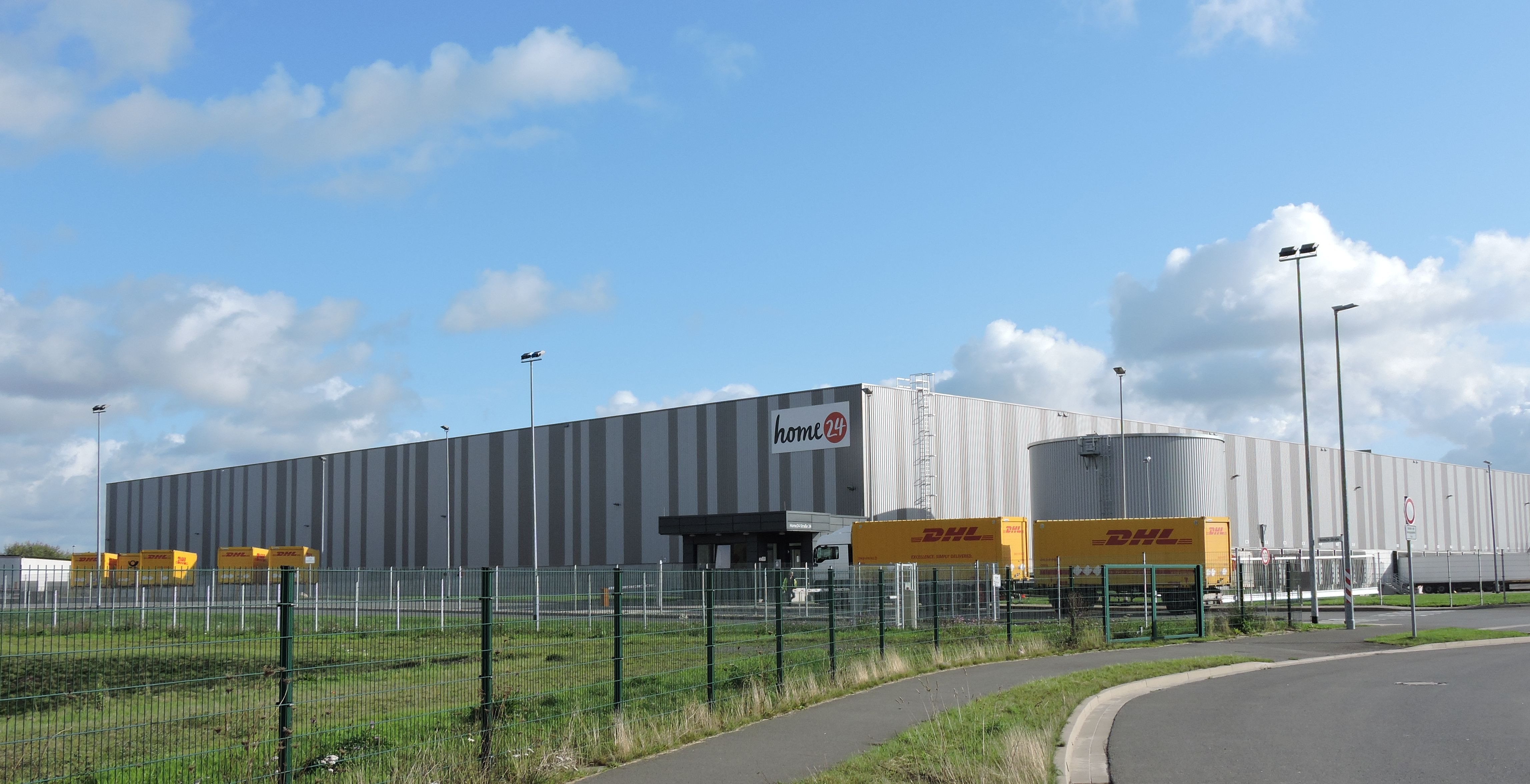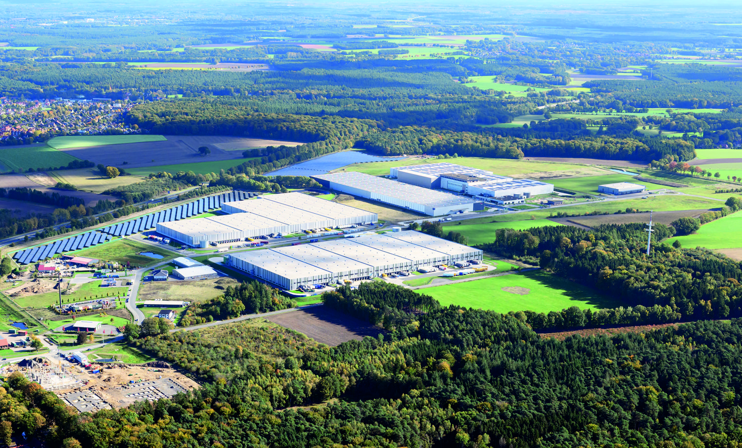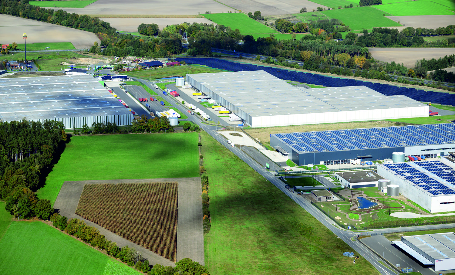 The image shows an aerial view of an extensive rural landscape with fields, forests and wind turbines in the background. Several large buildings and solar panels on roofs can be seen in the foreground, suggesting industrial or commercial use. © Deltaland, creator: Falcon Crest Air